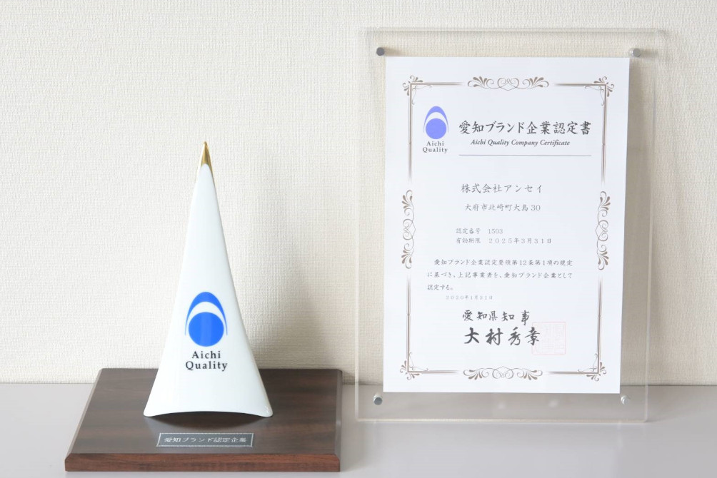 2020年1月に愛知県より、優れた理念、トップのリーダーシップのもと、業務プロセスの革新を進め、独自の強みを発揮し、環境に配慮しつつ、顧客起点のブランド価値等の構築による顧客価値を形成している製造企業として、『愛知ブランド企業』 に認定されました。
